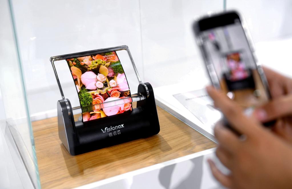 A visitor takes a photo of a double-side foldable screen at the China International Digital Economy Expo 2021 in Shijiazhuang, north China's Hebei Province, Sept. 7, 2021. (Xinhua/Wang Xiao)