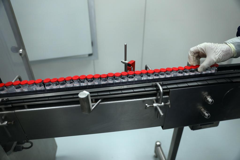 Photo taken on Sept. 6, 2021 shows COVID-19 vaccines on the production line of a factory of the Egyptian Holding Company for Biological Products and Vaccines (VACSERA) in Giza, Egypt. Egypt's state-owned vaccine maker VACSERA and Chinese biopharmaceutical company Sinovac signed an agreement in April of 2021 to jointly manufacture the Sinovac vaccines in VACSERA's factory in the North African country. (Xinhua/Ahmed Gomaa)