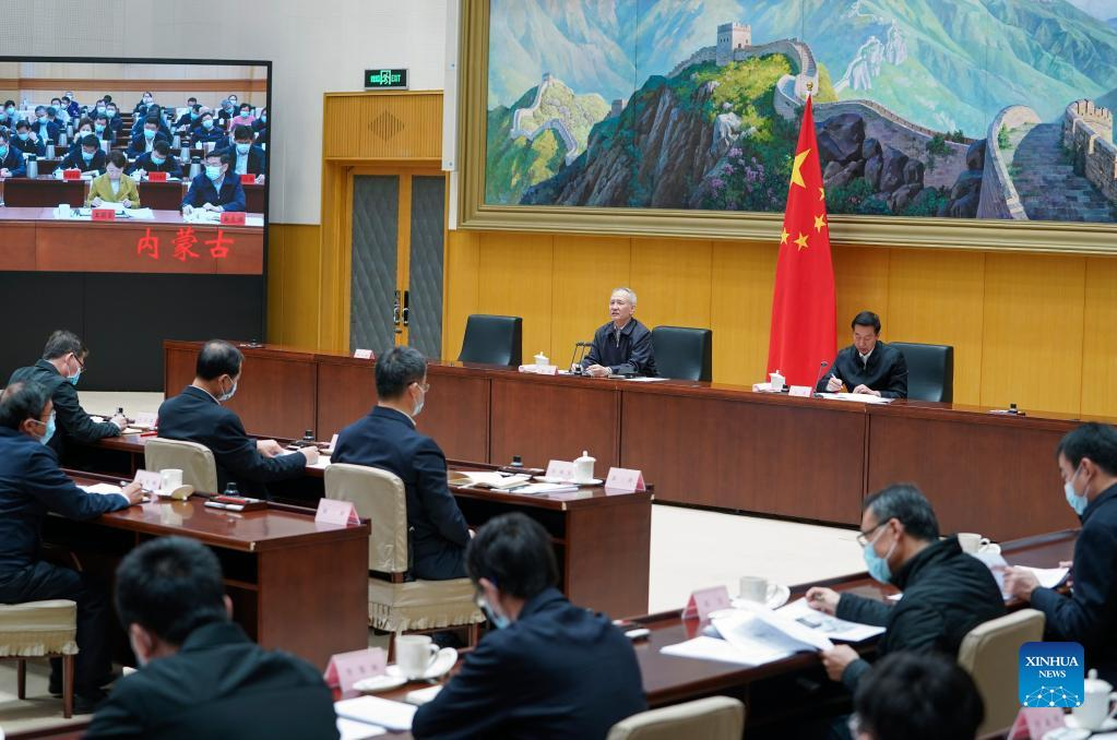 Chinese Vice Premier Liu He, also head of the Work Safety Committee of the State Council, and Wang Yong, state councilor and vice head of the committee, attend a national video and telephone conference on production safety in Beijing, capital of China, Jan. 17, 2022. (Xinhua/Zhang Ling)