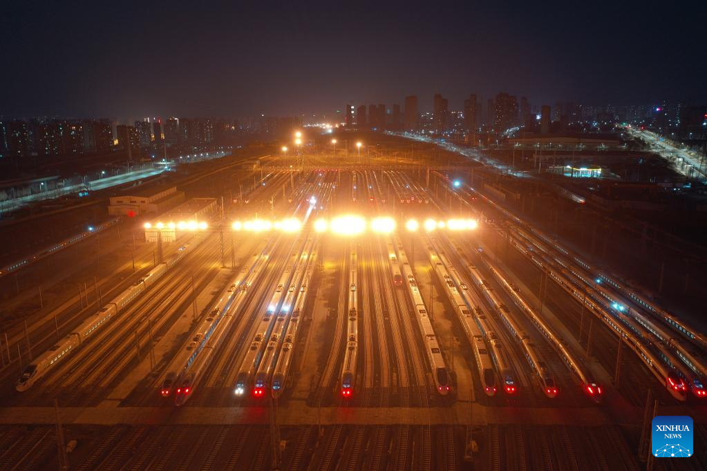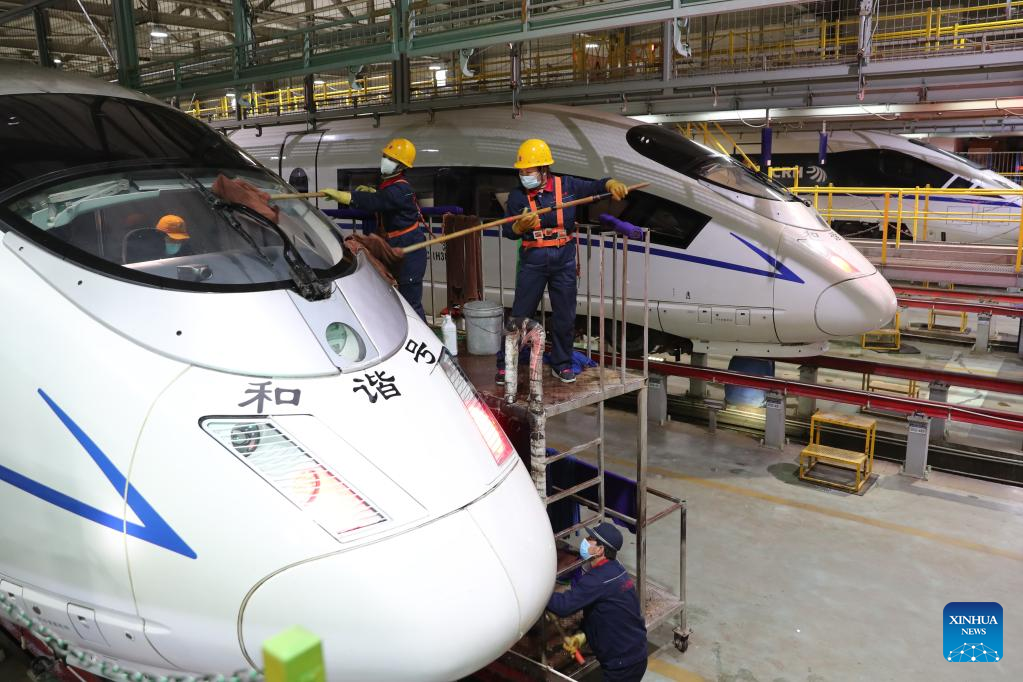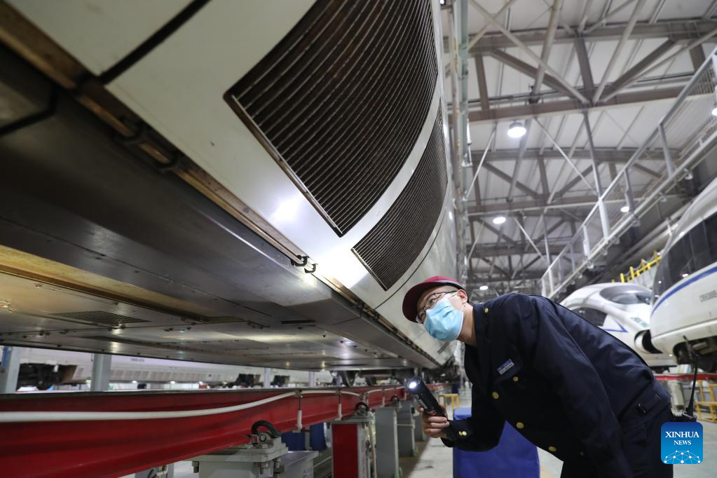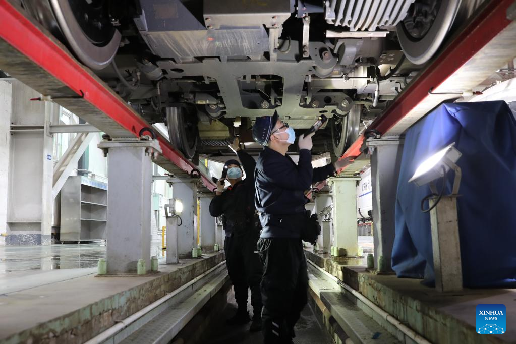Staff members check a bullet train at a maintenance base of Lanzhou West bullet train service station in Lanzhou, northwest China's Gansu Province, Jan. 16, 2022. Staff members from Lanzhou West bullet train service station of Lanzhou section of China Railway Lanzhou Group Co., Ltd. carried out maintenance work for trains to prepare for the country's annual Spring Festival travel rush.