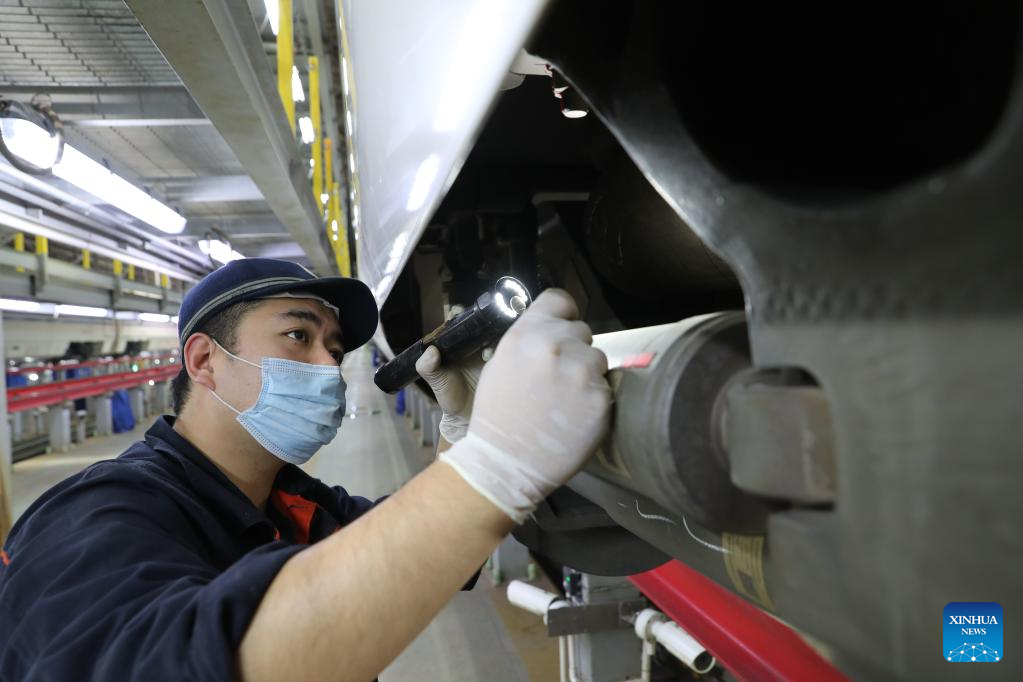 A staff member checks a bullet train at a maintenance base of Lanzhou West bullet train service station in Lanzhou, northwest China's Gansu Province, Jan. 16, 2022. Staff members from Lanzhou West bullet train service station of Lanzhou section of China Railway Lanzhou Group Co., Ltd. carried out maintenance work for trains to prepare for the country's annual Spring Festival travel rush.