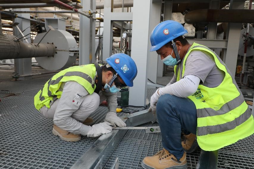 Photo taken on Nov. 8, 2021 shows workers busy at the construction site of a solar power project in Dubai, the United Arab Emirates. Shanghai Electric Group is the engineering, procurement and construction (EPC) contractor of the solar project. (People’s Daily/Zhou Zhou)