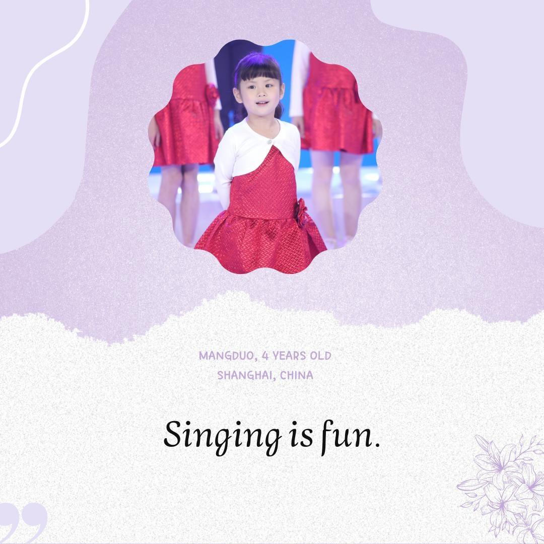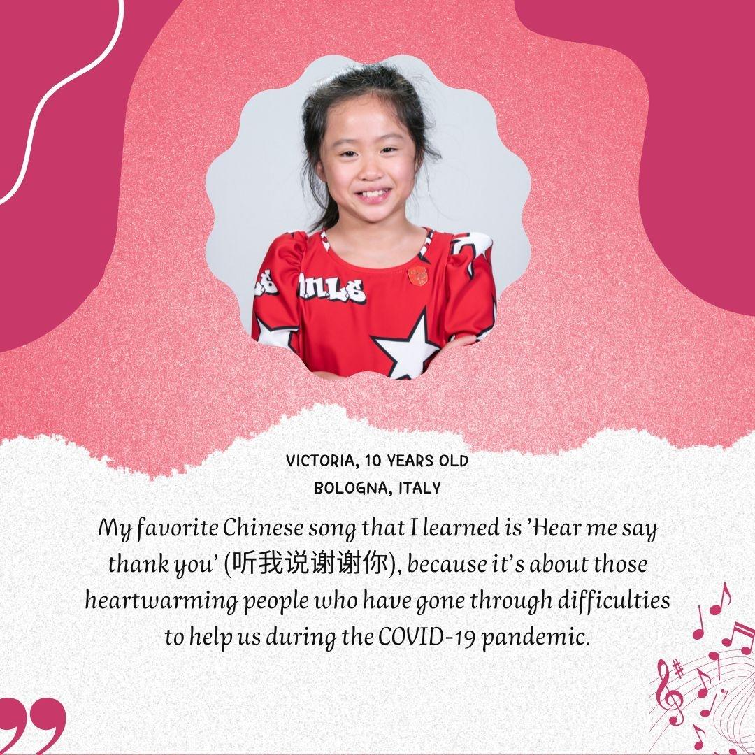 "My favorite Chinese song that I learned has the chorus of 'Hear me say thank you' (聽我說謝謝你), because it's about those heartwarming people who have gone through difficulties to help us during the COVID-19 pandemic," said Victoria, a 10-year-old child who, as one of the three lead singers, provided the audience with an unforgettable memory after singing this song during the 2021 Chinese New Year's concert.