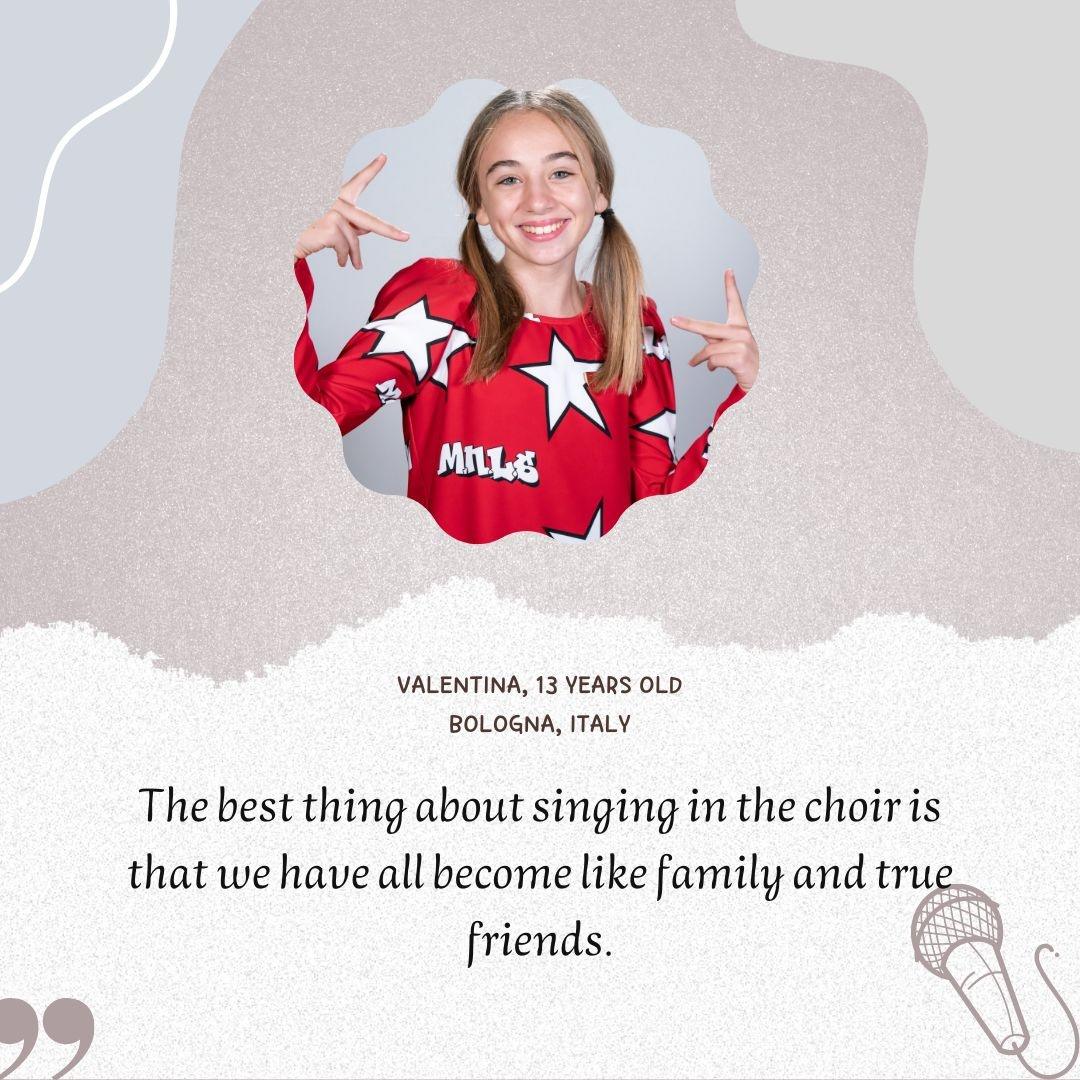 "The best thing about singing in the choir is that we have all become like family and true friends. The concerts, the travels, and the moving memories are also amazing," said Valentina while looking back on her six-year experience in the choir.
