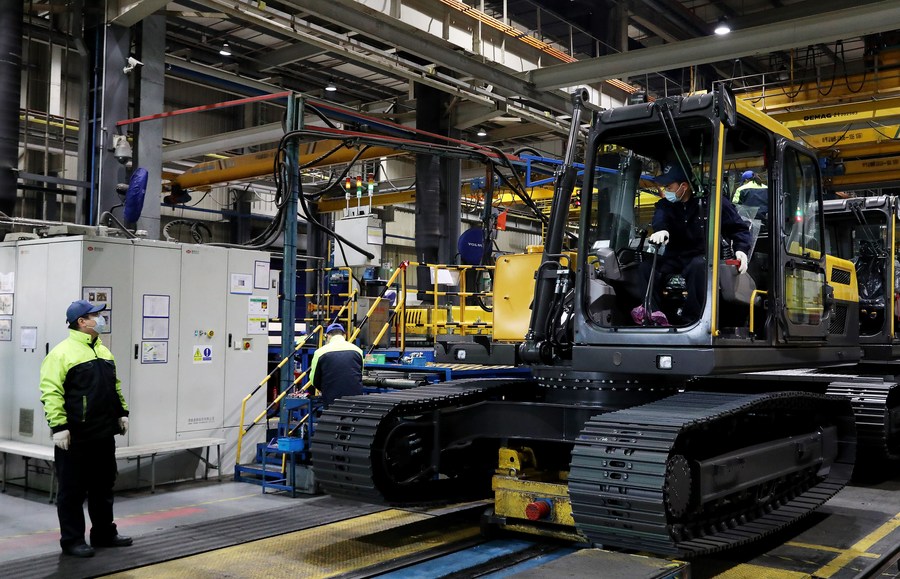 Workers test the transmission component of a vehicle on an excavator production line at the Volvo Construction Equipment (China) Co., Ltd. in east China's Shanghai, Dec. 17, 2020. (Xinhua/Fang Zhe)