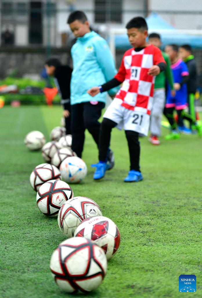 Pupils play football during winter vacation in Xuanen County, central China's Hubei Province, Jan. 18, 2022. (Photo by Song Wen/Xinhua)