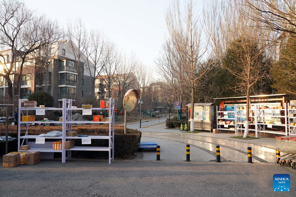 Photo taken on Jan. 18, 2022 shows a community under close-off management where a locally transmitted COVID-19 case was found in Haidian District of Beijing, capital of China. Beijing reported two confirmed locally transmitted COVID-19 cases and one other person testing positive for COVID-19 from Monday to 3 p.m. Tuesday, according to local authorities. The two confirmed cases were found in the Haidian District, while the person testing positive for COVID-19 was detected in Chaoyang District, said Pang Xinghuo, deputy head of the Beijing municipal center for disease control and prevention. The community where the newly-comfirmed case lives is under close-off management. Many frontline workers and volunteers have been devoted to ensuring sufficient food and medicine supplies for residents in the community. (Xinhua/Ren Chao)