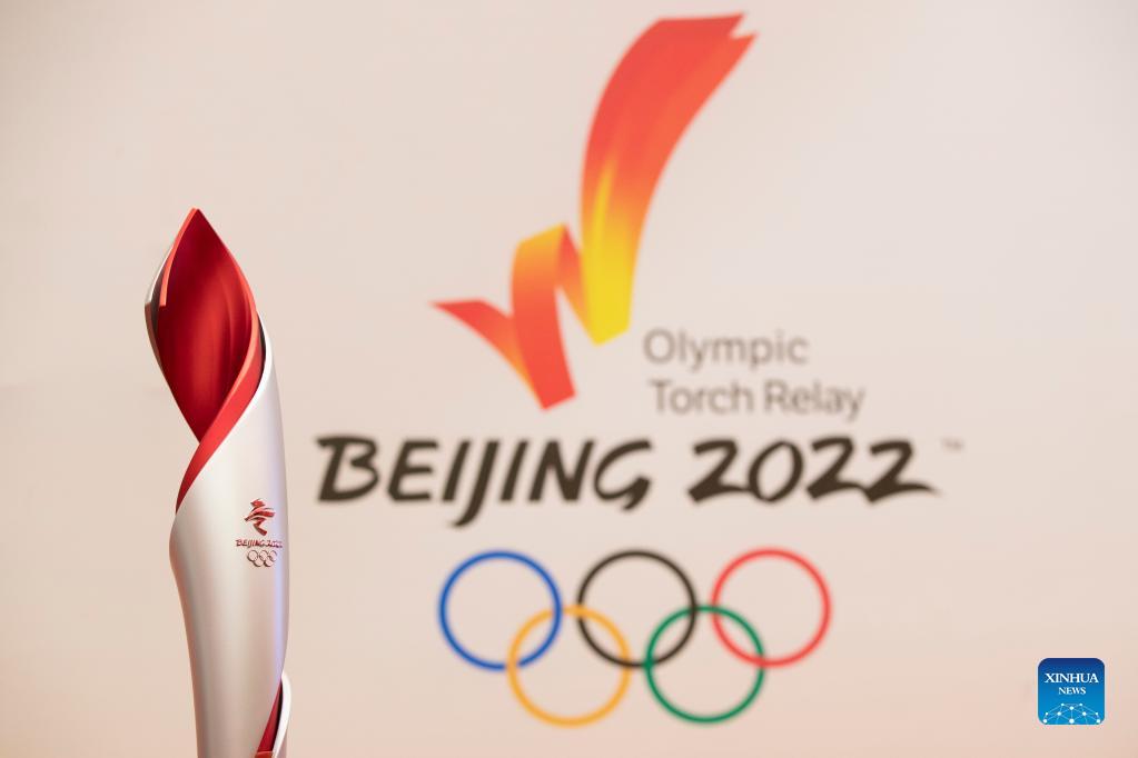 The torch is seen during the Torch Exhibition Tour of Olympic Winter Games Beijing 2022 in Harbin, northeast China's Heilongjiang Province, Jan. 5, 2022. (Xinhua/Zhang Tao)