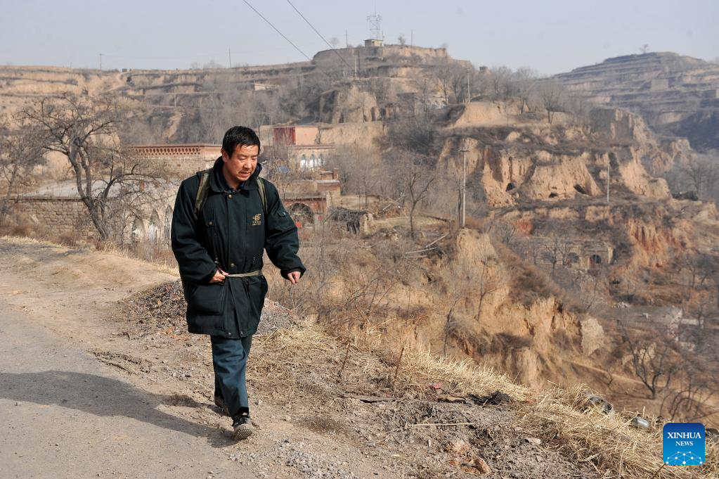 File photo taken on March 16, 2010 shows Wan Shouqiu on the way of delivering packages in Wangfeng Township of Taiyuan, north China's Shanxi Province. Located in a remote mountainous area in Wanbailin District of Taiyuan, Wangfeng Township had long suffered from poor transport infrastructure. In 1985, Wang Shouqiu became a postman of China Post serving Wangfeng Township, and held his post until a position transfer in 2020 due to his bad health condition.