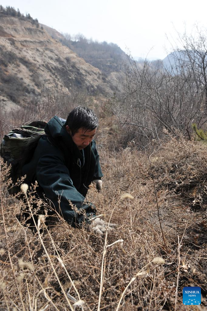 File photo taken on March 16, 2010 shows Wan Shouqiu on the way of delivering packages in Wangfeng Township of Taiyuan, north China's Shanxi Province. Located in a remote mountainous area in Wanbailin District of Taiyuan, Wangfeng Township had long suffered from poor transport infrastructure. In 1985, Wang Shouqiu became a postman of China Post serving Wangfeng Township, and held his post until a position transfer in 2020 due to his bad health condition.