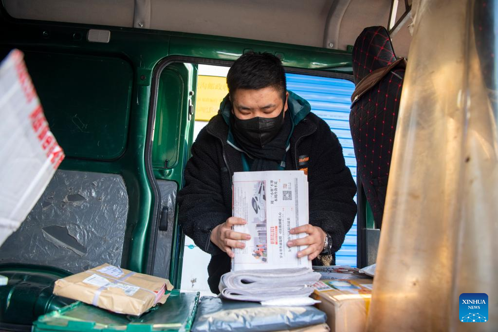 Wan Yuntian arranges newspapers at a delivery site in Taiyuan, north China's Shanxi Province, Jan. 5, 2022. Located in a remote mountainous area in Wanbailin District of Taiyuan, Wangfeng Township had long suffered from poor transport infrastructure. In 1985, Wang Shouqiu became a postman of China Post serving Wangfeng Township, and held his post until a position transfer in 2020 due to his bad health condition.