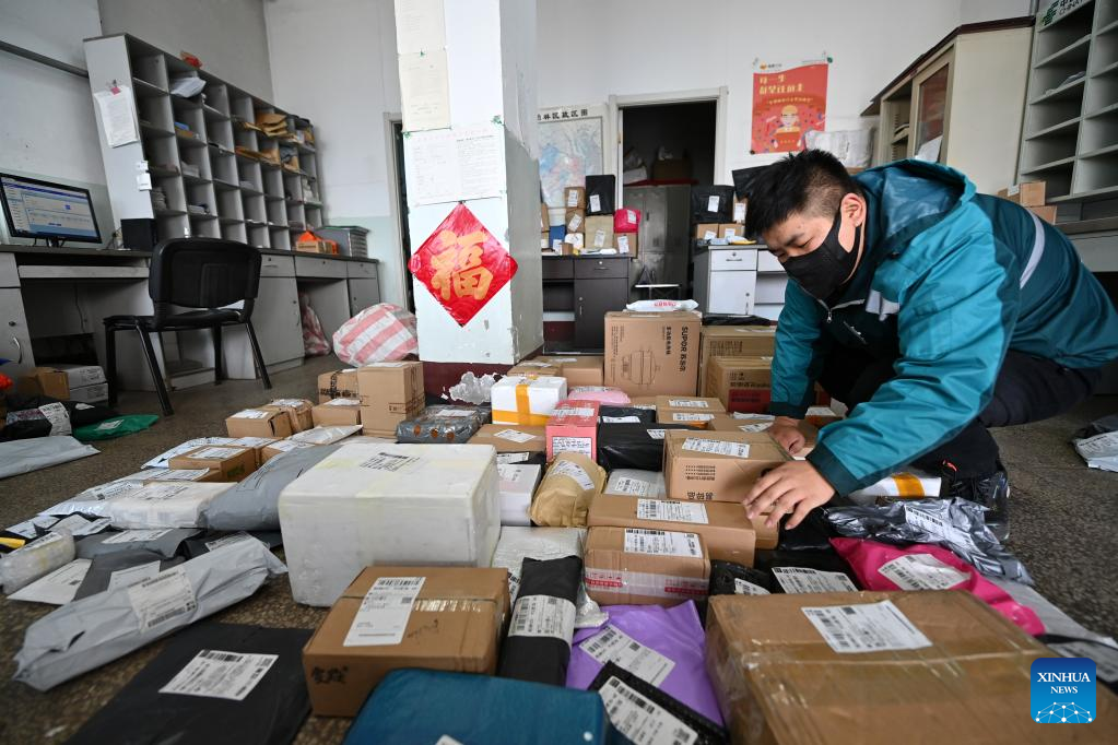 Wan Yuntian arranges packages at a delivery site in Taiyuan, north China's Shanxi Province, Jan. 7, 2022. Located in a remote mountainous area in Wanbailin District of Taiyuan, Wangfeng Township had long suffered from poor transport infrastructure. In 1985, Wang Shouqiu became a postman of China Post serving Wangfeng Township, and held his post until a position transfer in 2020 due to his bad health condition.