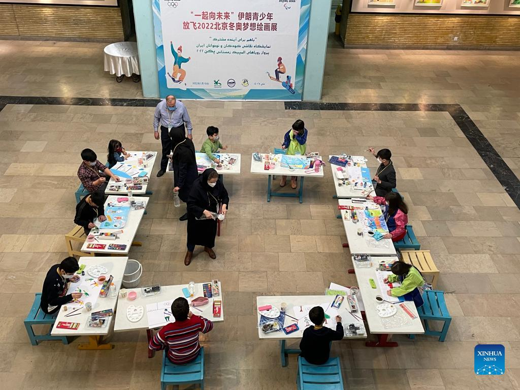 Iranian children paint for 2022 Beijing Winter Olympics in Tehran, Iran, Jan. 18, 2022. Iranian children on Tuesday painted live in an exhibition themed on the Beijing 2022 Olympics, drawing the Winter Olympics games in their minds. (Xinhua/Gao Wencheng)