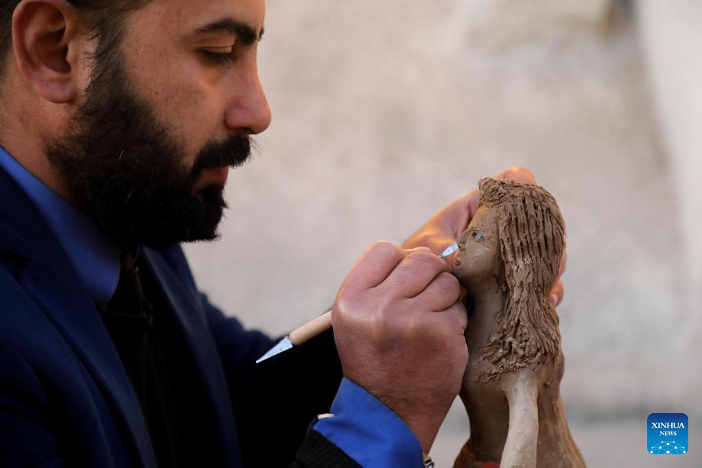 An artist sculpts a clay statue during a cultural evening event on Mutanabi Street in central Baghdad, Iraq, on Jan. 18, 2022. (Xinhua/Khalil Dawood)