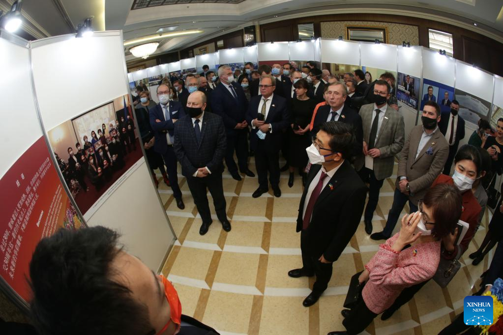 People visit a photo exhibition, which showcases more than 50 photographs depicting important events for China and Ukraine, in the Chinese Embassy in Kiev, Ukraine, Jan. 18, 2022. The Chinese Embassy in Ukraine held a reception on Tuesday to celebrate the 30th anniversary of the establishment of China-Ukraine diplomatic ties. (Photo by Sergey Starostenko/Xinhua)