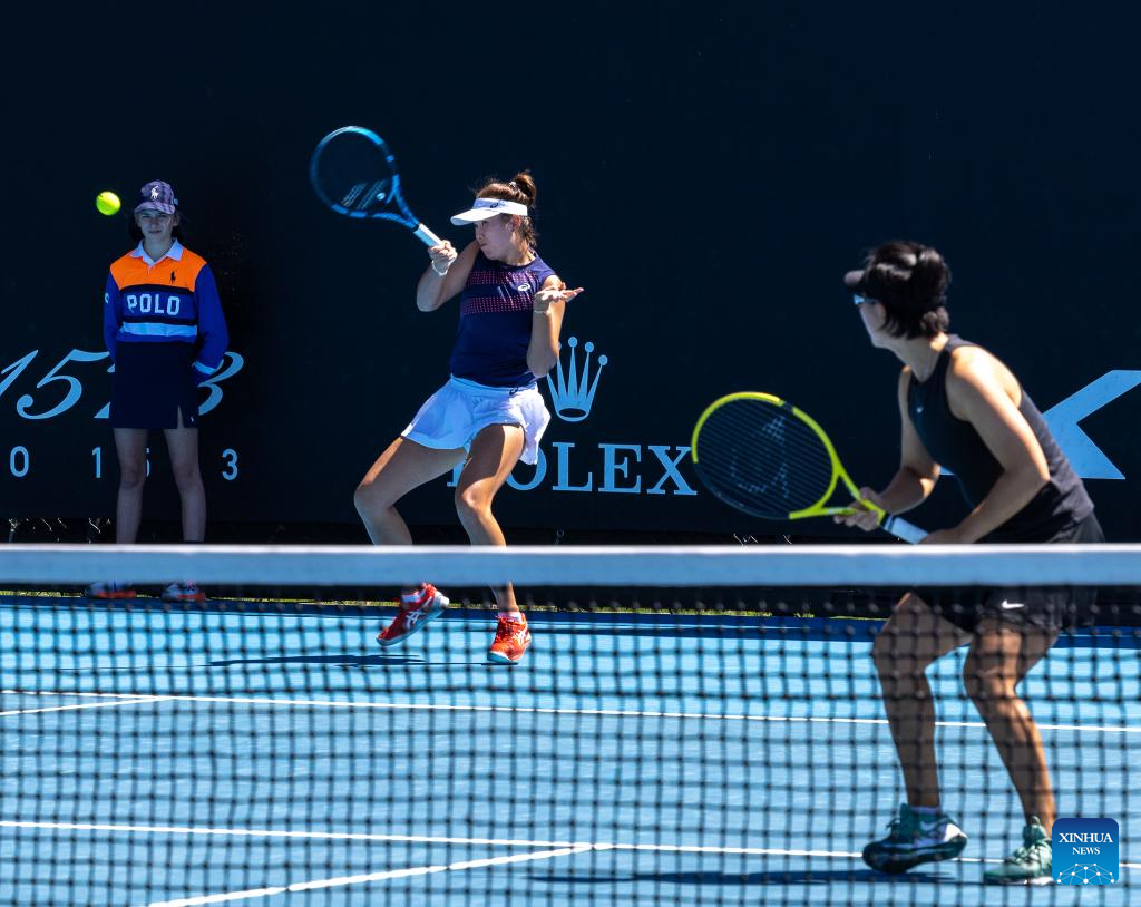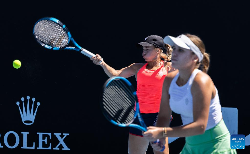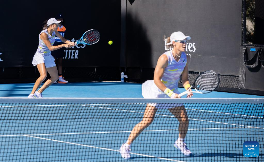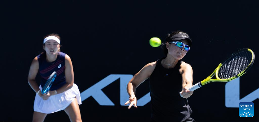 Xu Yifan/Yang Zhaoxuan (L) of China compete during the Women's Doubles first round match against Sofia Kenin of the United States/Yulia Putintseva of Kazakhstan at Australian Open in Melbourne Park, in Melbourne, Australia, Jan. 19, 2022. (Photo by Hu Jingchen/Xinhua)