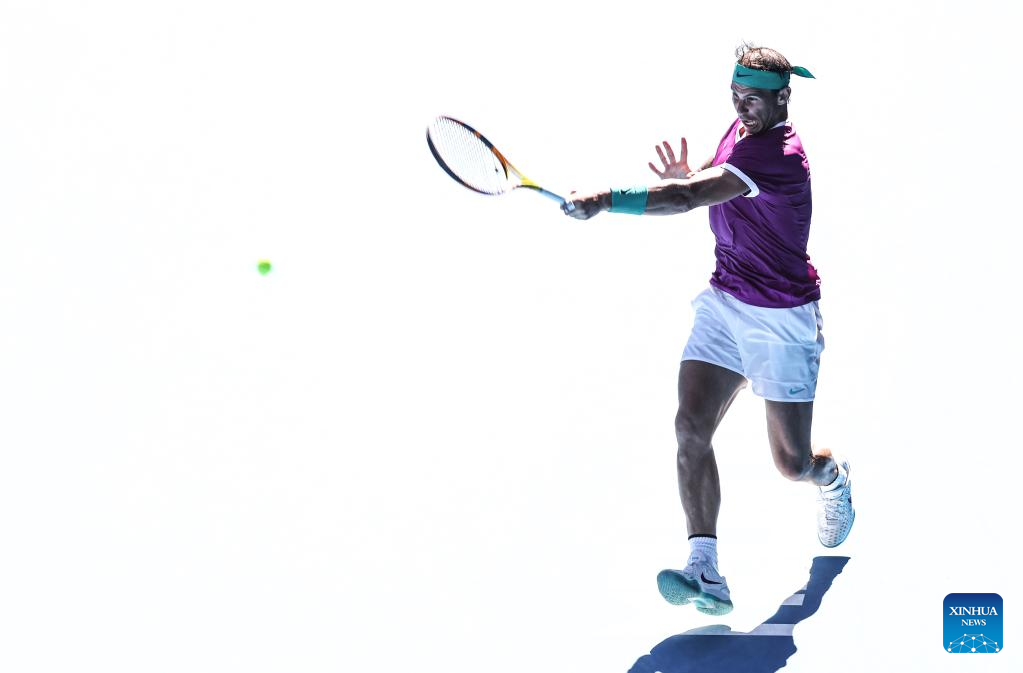 Rafael Nadal of Spain hits a return during the Men's Singles second round match against Yannick Hanfmann of Germany at Australian Open 2022 in Melbourne, Australia, Jan. 19, 2022. (Xinhua/Bai Xuefei)