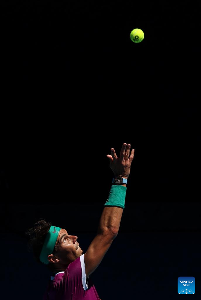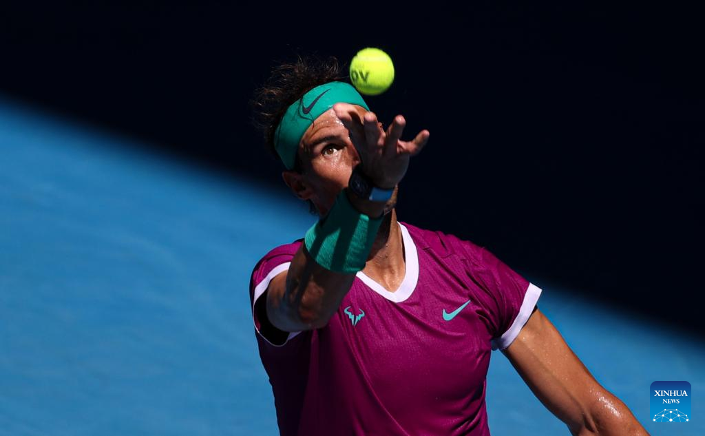 Rafael Nadal of Spain serves during the Men's Singles second round match against Yannick Hanfmann of Germany at Australian Open 2022 in Melbourne, Australia, Jan. 19, 2022. (Xinhua/Bai Xuefei)