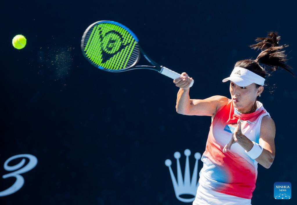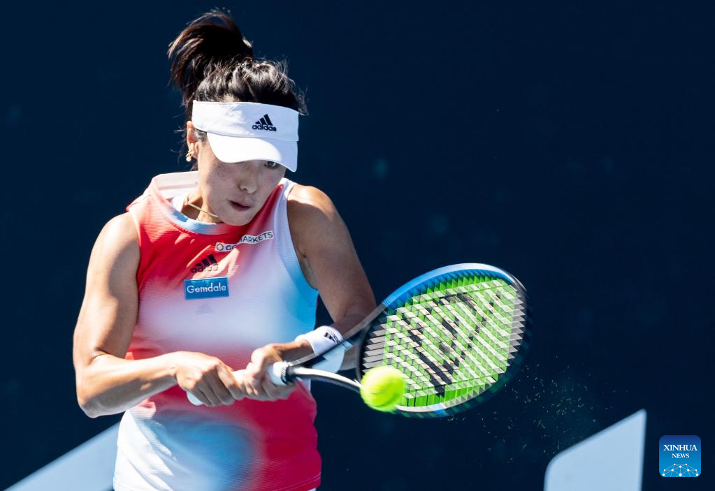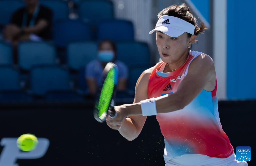 Wang Qiang of China hits a return during the Women's Singles second round match against Alison Van Uytvanck of Belgium at Australian Open 2022 in Melbourne, Australia, Jan. 19, 2022. (Photo by Hu Jingchen/Xinhua)