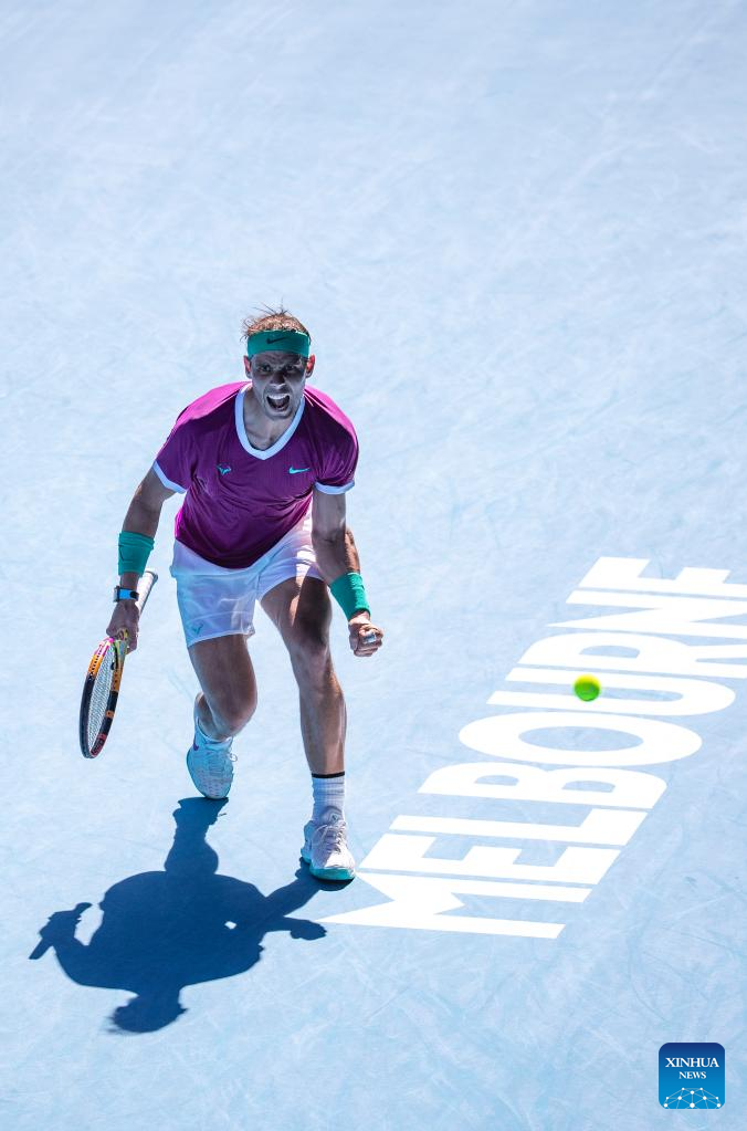 Rafael Nadal of Spain celebrates after winning the Men's Singles second round match against Yannick Hanfmann of Germany at Australian Open 2022 in Melbourne, Australia, Jan. 19, 2022. (Xinhua/Bai Xuefei)