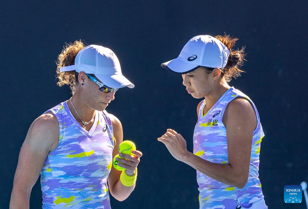 Zhang Shuai (L) of China/Samantha Stosur of Australia compete during the Women's Doubles first round match against Kato Miyu of Japan /Sabrina Santamaria of the United States at Australian Open 2022 in Melbourne, Australia, Jan. 19, 2022. (Photo by Hu Jingchen/Xinhua)