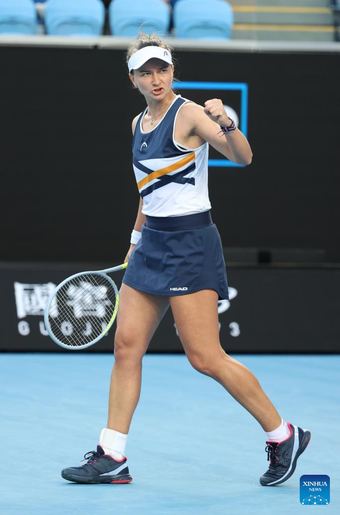 Barbora Krejcikova of the Czech Republic celebrates after winning the Women's Singles second round match against Wang Xiyu of China at Australian Open 2022 in Melbourne, Australia, Jan. 19, 2022. (Xinhua/Bai Xuefei)
