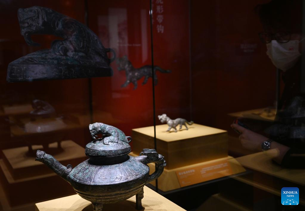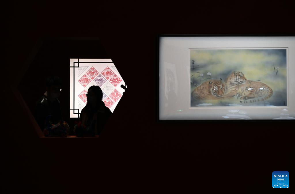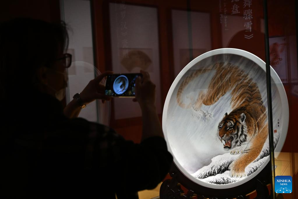 Photo taken on Jan. 19, 2022 shows exhibits displayed during the tiger-themed exhibition at the National Museum of China in Beijing, capital of China. As the Year of Tiger approaches, The Tiger as Talisman: 2022 Chinese New Year Exhibition, with a selection of artworks showcasing tiger in Chinese culture, opened to the public here on Wednesday. (Xinhua/Jin Liangkuai)