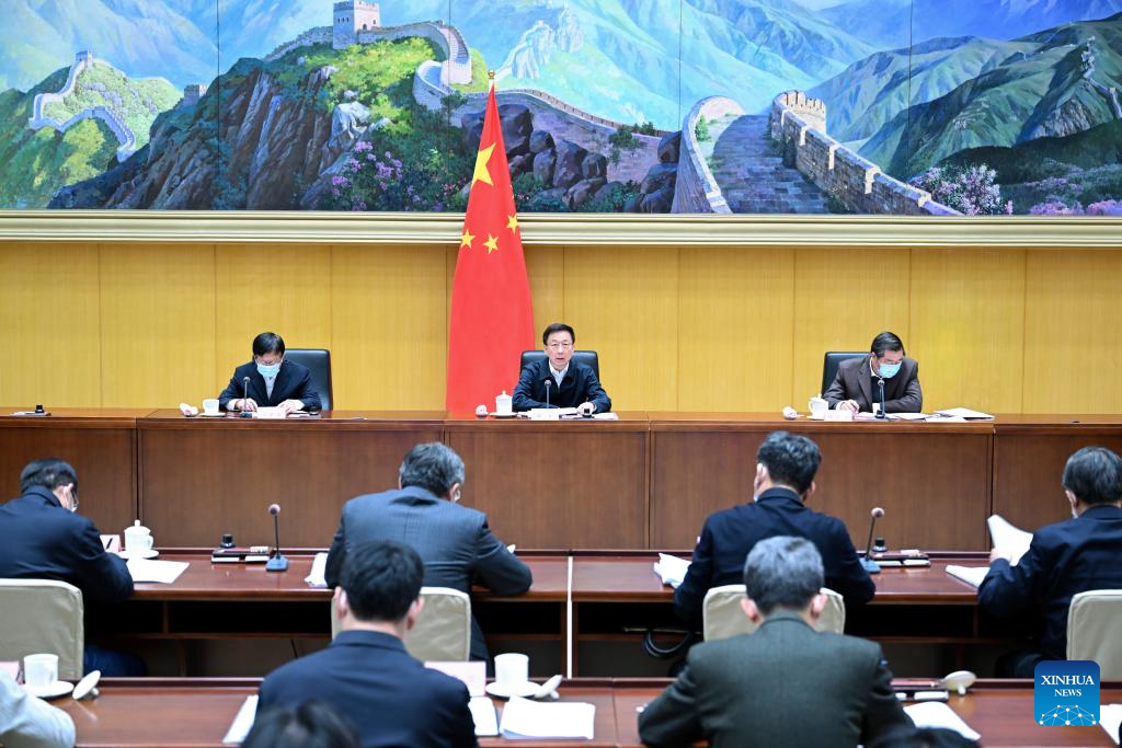 Chinese Vice Premier Han Zheng, also a member of the Standing Committee of the Political Bureau of the Communist Party of China Central Committee and head of the group leading the promotion of the integrated development of the Yangtze River Delta, chairs a meeting of the group, Jan. 18, 2022. (Xinhua/Zhang Ling)