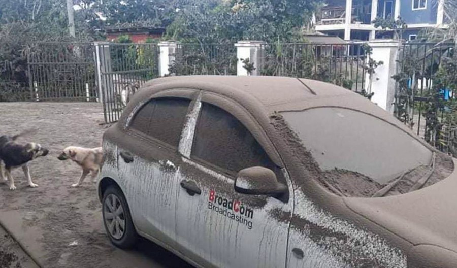 Photo taken on Jan. 20, 2022 shows a car covered by volcanic ash in Nuku'alofa in Tonga. (Photo by Marian Kupu/Xinhua)
