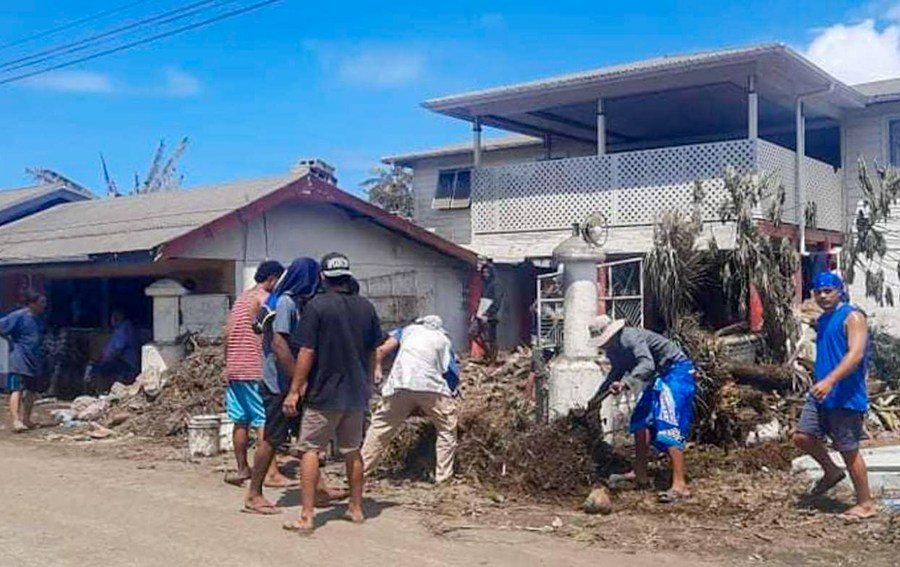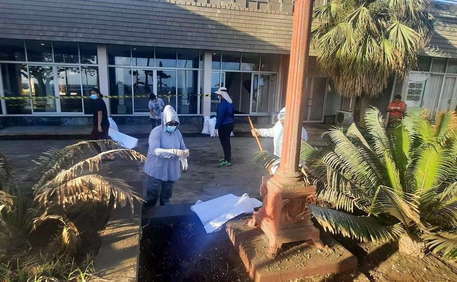 People work to clear ash and rubble in Nuku'alofa, capital of Tonga, Jan. 20, 2022. (Photo by Marian Kupu/Xinhua)