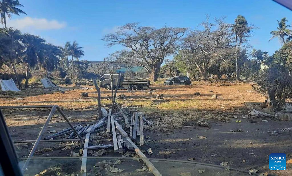 Photo taken on Jan. 20, 2022 shows the view of tsunami-hit Nuku'alofa, capital of Tonga. On Friday and Saturday, the Hunga Tonga-Hunga Ha'apai volcano in Tonga erupted violently and triggered tsunami in Tonga. (Photo by Marian Kupu/Xinhua)