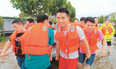 Pei Jiang (front C) and his colleagues participate in disaster relief efforts in a flood-stricken area in July 2021. (Photo/People's Daily Overseas Edition)