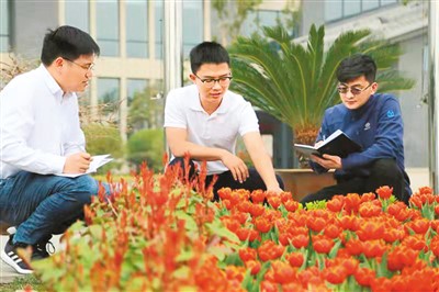 Pei Jiang (C) and his colleagues check the growth progress of tulips at a planting base. (Photo/People's Daily Overseas Edition)