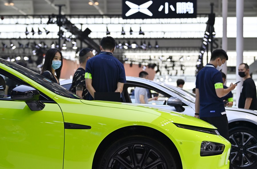 Visitors view cars from XPeng Motors during China (Tianjin) Auto Show 2021 in north China's Tianjin, Sept. 29, 2021. (Xinhua/Li Ran)
