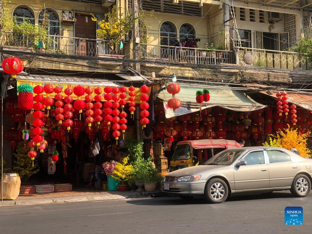 Photo taken on Jan. 16, 2022 shows shops selling Chinese Lunar New Year decorations in Phnom Penh, Cambodia. (Photo by Van Pov/Xinhua)