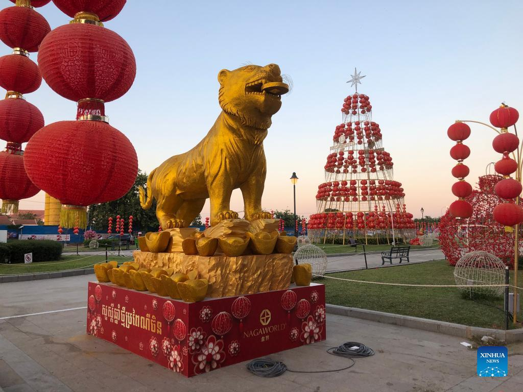 Photo taken on Jan. 20, 2022 shows a statue of tiger at a public park for the upcoming Chinese Lunar New Year of Tiger in Phnom Penh, Cambodia. (Photo by Van Pov/Xinhua)