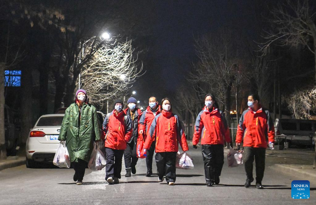 Medical workers head for a COVID-19 testing site at dawn in north China's Tianjin, Jan. 20, 2022.