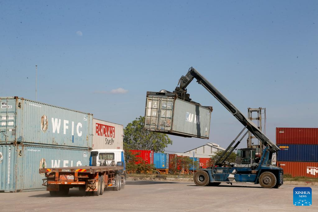 Photo taken on Jan. 13, 2022 shows containers at the Hong Leng Huor Dry Port on the western suburb of Phnom Penh, Cambodia. (Photo by Phearum/Xinhua)