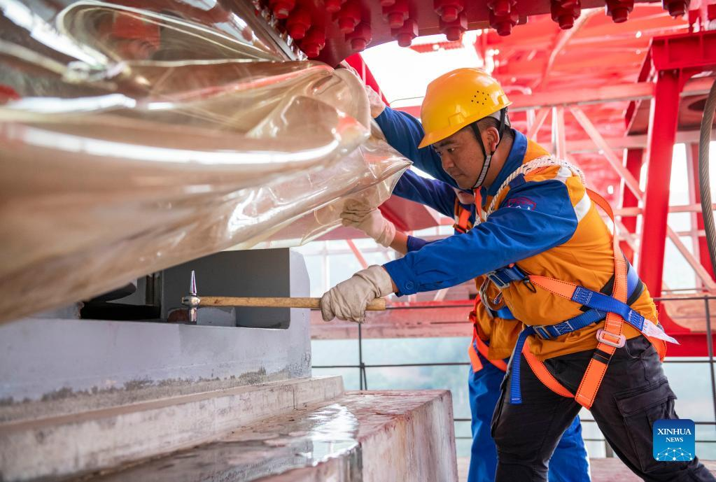 Shi Pengbin (R) and his colleague work on the Yuanjiang major bridge over the Yuanjiang River in southwest China's Yunnan Province, Jan. 18, 2022. Shi Pengbin, 28, is a technician responsible for maintaining the Yuanjiang major bridge, a key bridge of the China-Laos Railway project. Spanning a full length of 832.2 meters, the Yuanjiang bridge uses six bridge piers with the No.3 bridge pier, the highest pier, standing at 154 meters. Shi, who started working for the construction of the China-Laos Railway from April 2020, even postponed his wedding to guarantee on-time completion of the bridge. After the operation of China-Laos Railway, Shi's work includes checking the bridge in high places during the day, and repairing the bridge floor during the break time for rail service at night. During this year's Spring Festival holiday, Shi and his colleagues will stick to their posts to secure the railway transportation. (Xinhua/Chen Xinbo)
