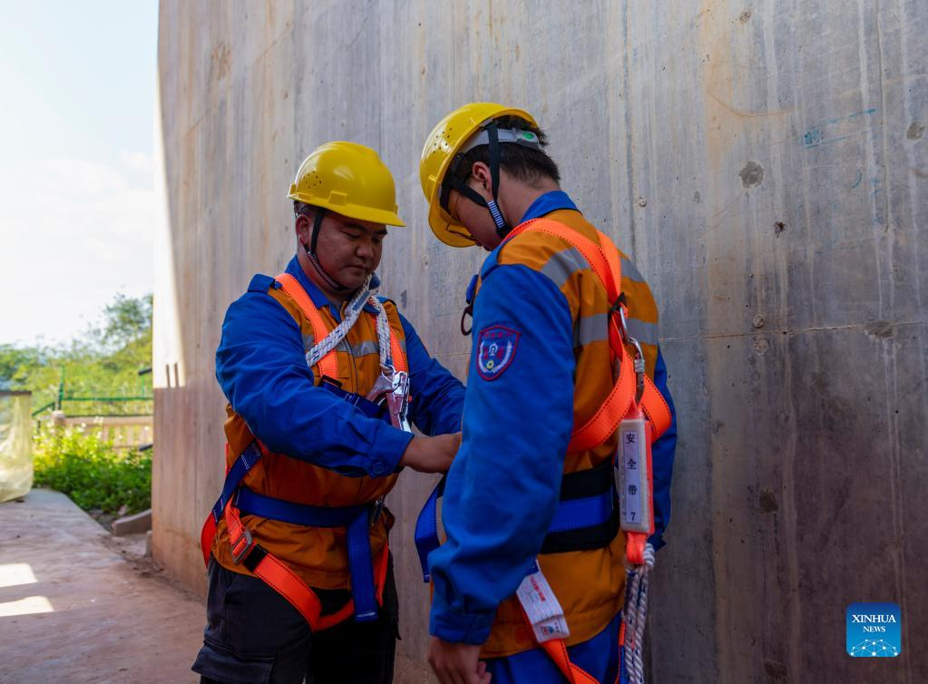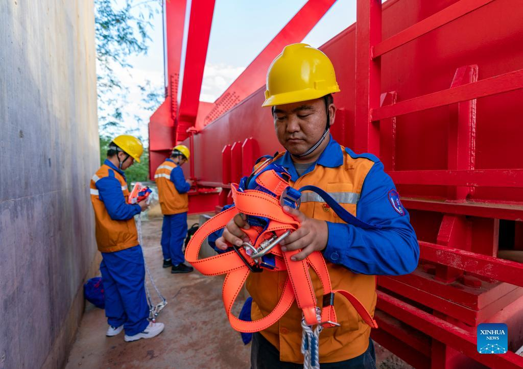 Shi Pengbin (L), helps his colleague with safety belt at the Yuanjiang major bridge over the Yuanjiang River in southwest China's Yunnan Province, Jan. 18, 2022. Shi Pengbin, 28, is a technician responsible for maintaining the Yuanjiang major bridge, a key bridge of the China-Laos Railway project. Spanning a full length of 832.2 meters, the Yuanjiang bridge uses six bridge piers with the No.3 bridge pier, the highest pier, standing at 154 meters. Shi, who started working for the construction of the China-Laos Railway from April 2020, even postponed his wedding to guarantee on-time completion of the bridge. After the operation of China-Laos Railway, Shi's work includes checking the bridge in high places during the day, and repairing the bridge floor during the break time for rail service at night. During this year's Spring Festival holiday, Shi and his colleagues will stick to their posts to secure the railway transportation. (Xinhua/Chen Xinbo)
