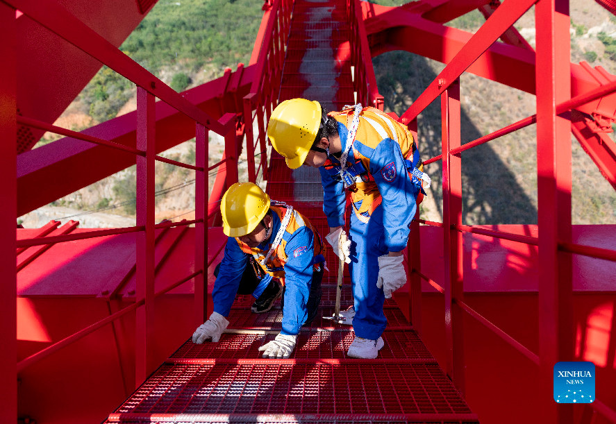 Shi Pengbin (L) and his colleague maintain the Yuanjiang major bridge over the Yuanjiang River in southwest China's Yunnan Province, Jan. 19, 2022. Shi Pengbin, 28, is a technician responsible for maintaining the Yuanjiang major bridge, a key bridge of the China-Laos Railway project. Spanning a full length of 832.2 meters, the Yuanjiang bridge uses six bridge piers with the No.3 bridge pier, the highest pier, standing at 154 meters. Shi, who started working for the construction of the China-Laos Railway from April 2020, even postponed his wedding to guarantee on-time completion of the bridge. After the operation of China-Laos Railway, Shi's work includes checking the bridge in high places during the day, and repairing the bridge floor during the break time for rail service at night. During this year's Spring Festival holiday, Shi and his colleagues will stick to their posts to secure the railway transportation. (Xinhua/Chen Xinbo)