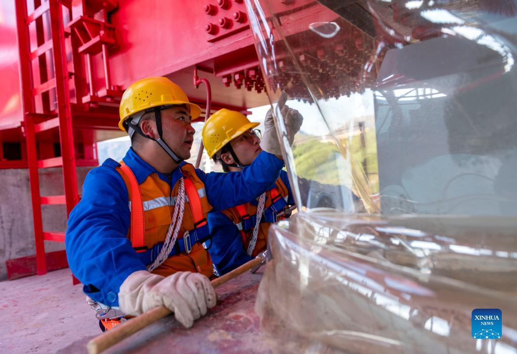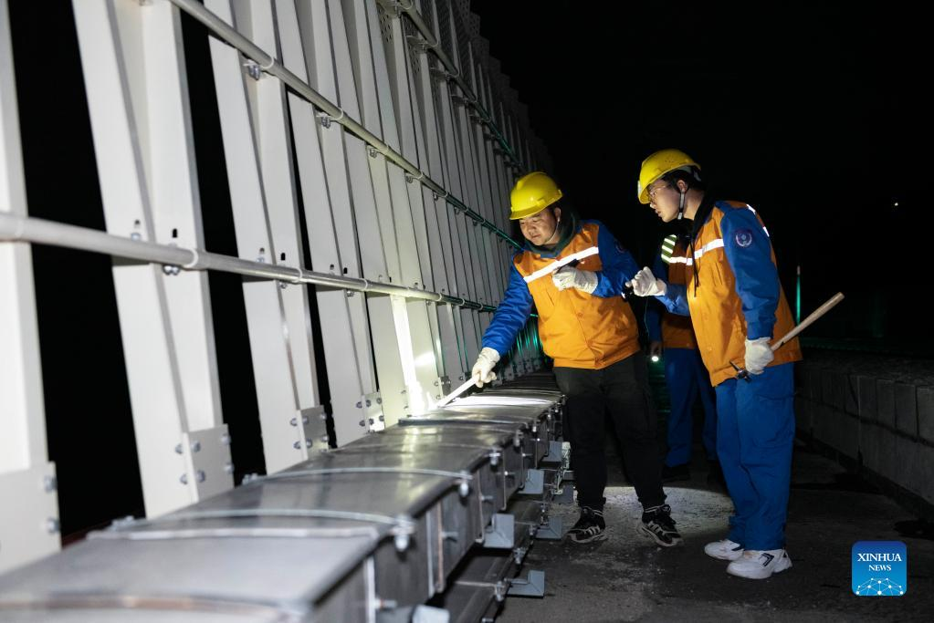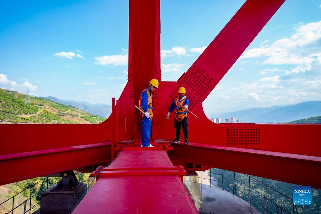Shi Pengbin (L) and his colleague check the windproof equipment of the Yuanjiang major bridge over the Yuanjiang River in southwest China's Yunnan Province, Jan. 19, 2022. Shi Pengbin, 28, is a technician responsible for maintaining the Yuanjiang major bridge, a key bridge of the China-Laos Railway project. Spanning a full length of 832.2 meters, the Yuanjiang bridge uses six bridge piers with the No.3 bridge pier, the highest pier, standing at 154 meters. Shi, who started working for the construction of the China-Laos Railway from April 2020, even postponed his wedding to guarantee on-time completion of the bridge. After the operation of China-Laos Railway, Shi's work includes checking the bridge in high places during the day, and repairing the bridge floor during the break time for rail service at night. During this year's Spring Festival holiday, Shi and his colleagues will stick to their posts to secure the railway transportation. (Xinhua/Chen Xinbo)