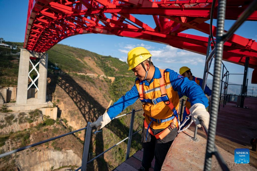 Shi Pengbin checks the Yuanjiang major bridge over the Yuanjiang River in southwest China's Yunnan Province, Jan. 18, 2022. Shi Pengbin, 28, is a technician responsible for maintaining the Yuanjiang major bridge, a key bridge of the China-Laos Railway project. Spanning a full length of 832.2 meters, the Yuanjiang bridge uses six bridge piers with the No.3 bridge pier, the highest pier, standing at 154 meters. Shi, who started working for the construction of the China-Laos Railway from April 2020, even postponed his wedding to guarantee on-time completion of the bridge. After the operation of China-Laos Railway, Shi's work includes checking the bridge in high places during the day, and repairing the bridge floor during the break time for rail service at night. During this year's Spring Festival holiday, Shi and his colleagues will stick to their posts to secure the railway transportation. (Xinhua/Chen Xinbo)