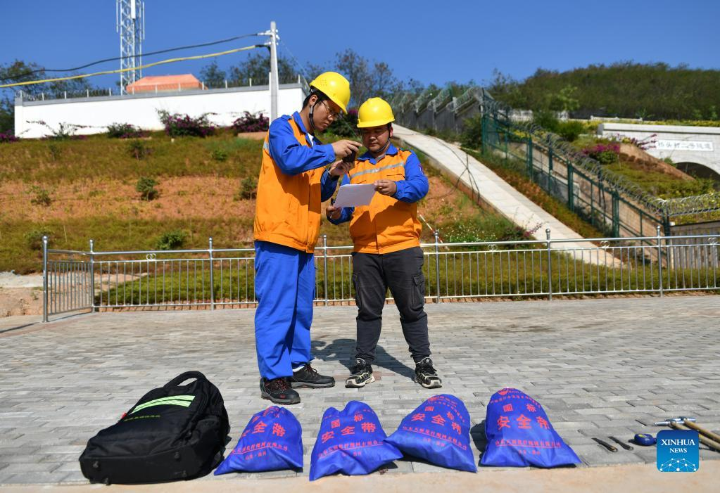 Shi Pengbin (R), arranges his safety belt at the Yuanjiang major bridge over the Yuanjiang River in southwest China's Yunnan Province, Jan. 18, 2022. Shi Pengbin, 28, is a technician responsible for maintaining the Yuanjiang major bridge, a key bridge of the China-Laos Railway project. Spanning a full length of 832.2 meters, the Yuanjiang bridge uses six bridge piers with the No.3 bridge pier, the highest pier, standing at 154 meters. Shi, who started working for the construction of the China-Laos Railway from April 2020, even postponed his wedding to guarantee on-time completion of the bridge. After the operation of China-Laos Railway, Shi's work includes checking the bridge in high places during the day, and repairing the bridge floor during the break time for rail service at night. During this year's Spring Festival holiday, Shi and his colleagues will stick to their posts to secure the railway transportation. (Xinhua/Chen Xinbo)