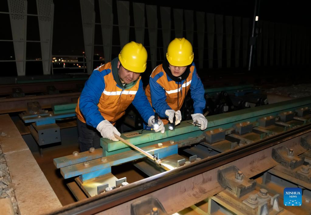 Shi Pengbin and his colleague check the bearing of Yuanjiang major bridge over the Yuanjiang River in southwest China's Yunnan Province, Jan. 18, 2022. Shi Pengbin, 28, is a technician responsible for maintaining the Yuanjiang major bridge, a key bridge of the China-Laos Railway project. Spanning a full length of 832.2 meters, the Yuanjiang bridge uses six bridge piers with the No.3 bridge pier, the highest pier, standing at 154 meters. Shi, who started working for the construction of the China-Laos Railway from April 2020, even postponed his wedding to guarantee on-time completion of the bridge. After the operation of China-Laos Railway, Shi's work includes checking the bridge in high places during the day, and repairing the bridge floor during the break time for rail service at night. During this year's Spring Festival holiday, Shi and his colleagues will stick to their posts to secure the railway transportation. (Xinhua/Chen Xinbo)