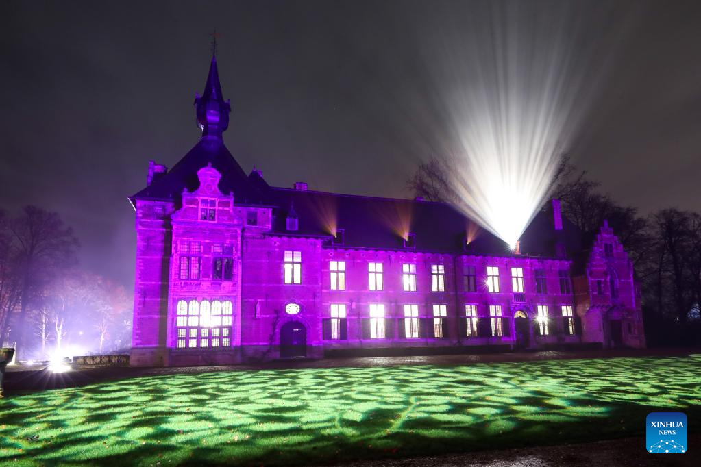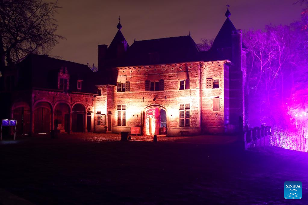 Photo taken on Jan. 20, 2022 shows a light installation at the preview of the immersive light show "Nature Illuminated" at Groot-Bijgaarden Castle in Dilbeek, near Brussels, Belgium. With sound and laser lighting display, the light show "Nature Illuminated" provides the audience with immersive experience to perceive season changes in nature. It will open to public from Jan. 21 to March 20. (Xinhua/Zhang Cheng)