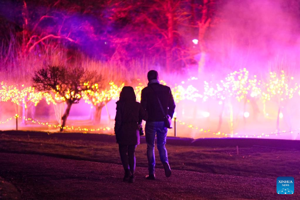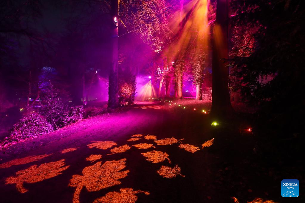 People walk past a light installation at the preview of the immersive light show "Nature Illuminated" at Groot-Bijgaarden Castle in Dilbeek, near Brussels, Belgium, Jan. 20, 2022. With sound and laser lighting display, the light show "Nature Illuminated" provides the audience with immersive experience to perceive season changes in nature. It will open to public from Jan. 21 to March 20. (Xinhua/Zhang Cheng)