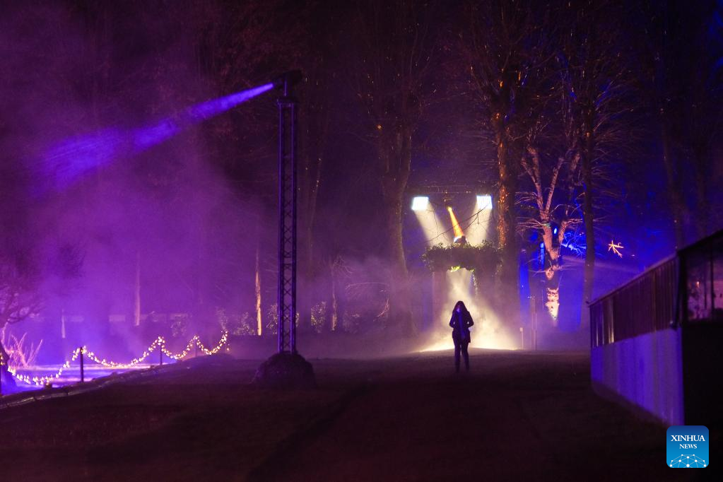 A woman walks past a light installation at the preview of the immersive light show "Nature Illuminated" at Groot-Bijgaarden Castle in Dilbeek, near Brussels, Belgium, Jan. 20, 2022. With sound and laser lighting display, the light show "Nature Illuminated" provides the audience with immersive experience to perceive season changes in nature. It will open to public from Jan. 21 to March 20. (Xinhua/Zhang Cheng)