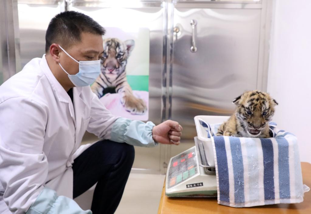 Staff member Lei Shengqiao weighs a twin cub of south China tiger at the research base of south China tiger breeding in Shaoguan City of south China's Guangdong Province, Jan. 20, 2022. Mengmeng, a south China tiger, gave birth to twin cubs on Dec. 31, 2021 after its two cubs Yuanyuan and Qingqing were born in March and September 2021. (Xinhua/Huang Guobao)