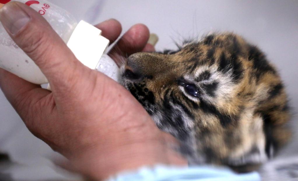 Staff member Lei Shengqiao feeds a twin cub of south China tiger at the research base of south China tiger breeding in Shaoguan City of south China's Guangdong Province, Jan. 20, 2022. Mengmeng, a south China tiger, gave birth to twin cubs on Dec. 31, 2021 after its two cubs Yuanyuan and Qingqing were born in March and September 2021. (Xinhua/Huang Guobao)